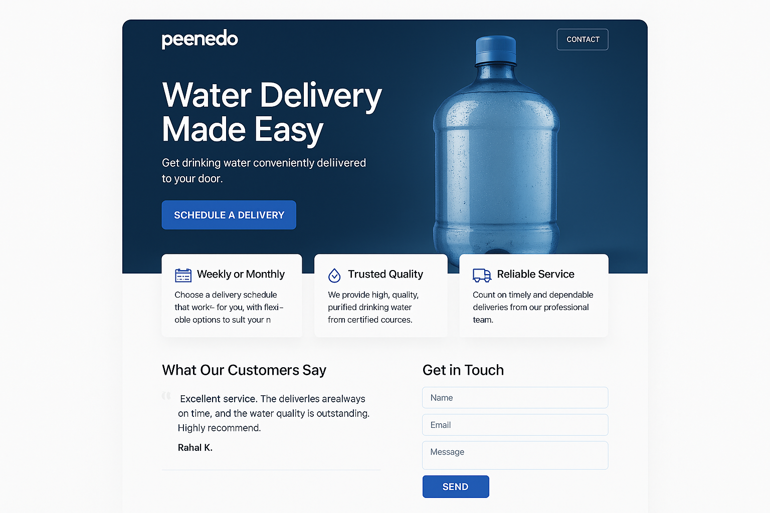 Peenedo.com is your gateway to revolutionizing water delivery services in India. This domain encapsulates the promise of convenience and quality, offering an innovative platform for seamless water delivery right to your doorstep. With the increasing demand for reliable and timely water supply, peenedo.com stands out as a memorable and brandable domain that caters to the needs of households and businesses seeking efficient water delivery solutions. Whether it's weekly or monthly deliveries, peenedo.com is positioned to become a household name in the water delivery market, ensuring that each transaction is synonymous with quality and trust.